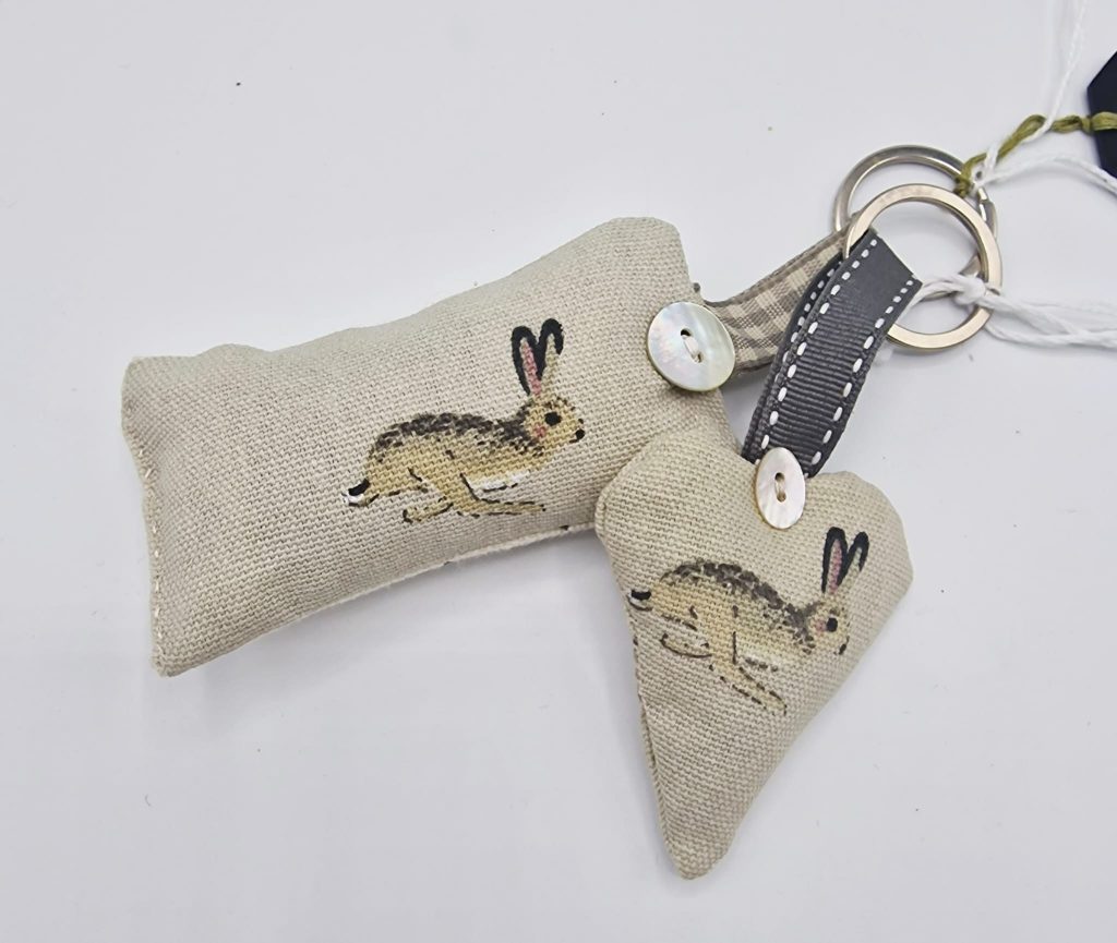 Sandy’s jointed hares are made using traditional teddy bear techniques, strengthened with button thread and buttons or fabric and wool circles. Each hare has an individually shaped and stitched face, patchwork detailing and a needle-felted wool tail. She also creates hand-painted calico Indian Runner Ducks, assembled using toymaking methods, painted with acrylic and Inktense, heat-set for durability and finished with glass eyes.